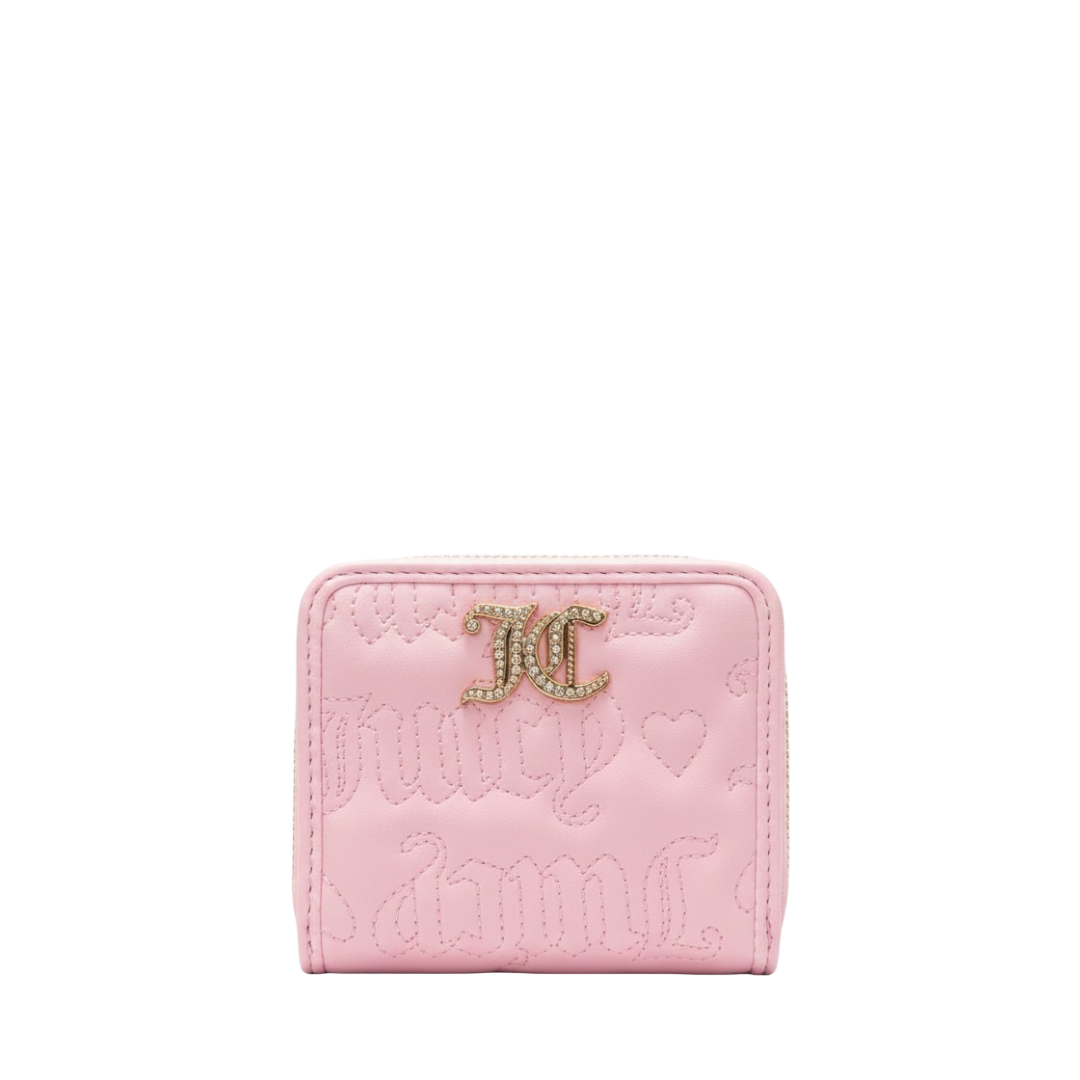 La cartera Juicy Couture Sandstone Lovely Girl Small ZA presenta un diseño sólido con detalles acolchados a tono, que lucen un corazón y elementos glamurosos. Hecha de piel sintética en color rosa. También cuenta con un tirador de cierre en forma de corazón dorado, una ventana transparente para identificación, ranuras para tarjetas, una ranura para billetes, un bolsillo con cierre y una placa con el logotipo de JC en dorado con detalles de perlas blancas.