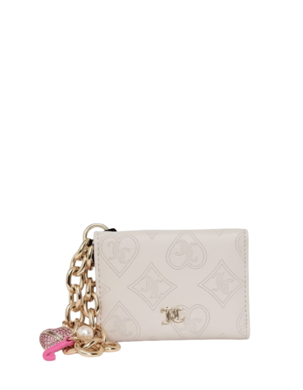 Tarjetero de piel sintética color arenisca de primera calidad. Presenta un patrón de diamantes y corazones en relieve en la parte frontal, con una JC en cada diamante y corazón. El tarjetero lleva una gruesa correa de cadena dorada con un dije de J de esmalte rosa, un dije redondo de perla blanca y un corazón dorado con detalles de cristal rosa. El tarjetero tiene cierre a presión. La parte posterior de la cartera tiene ventana transparente para identificación. El interior tiene 4 ranuras para tarjetas. Forro blanco y negro con estampado gráfico de Juicy Couture. “My Heart Belongs To Juicy”