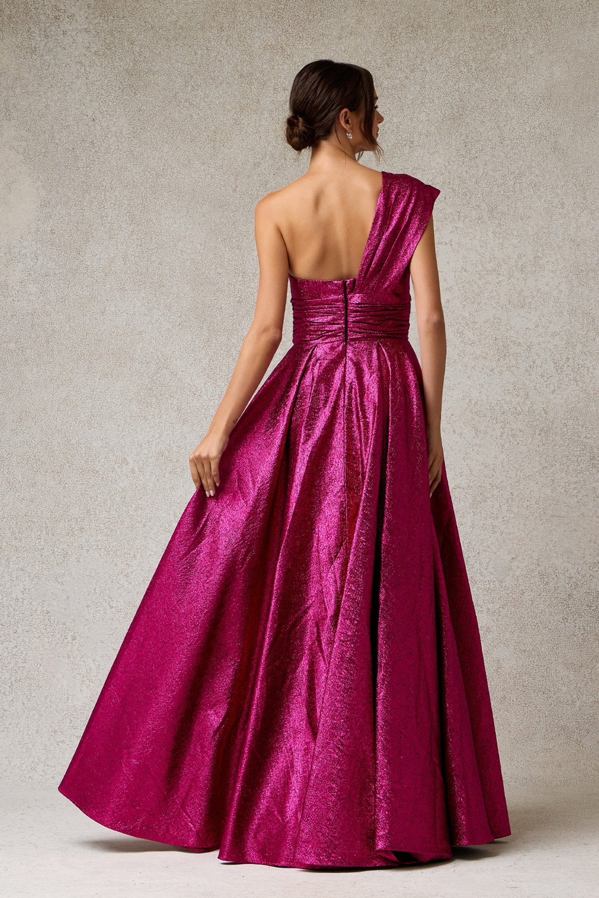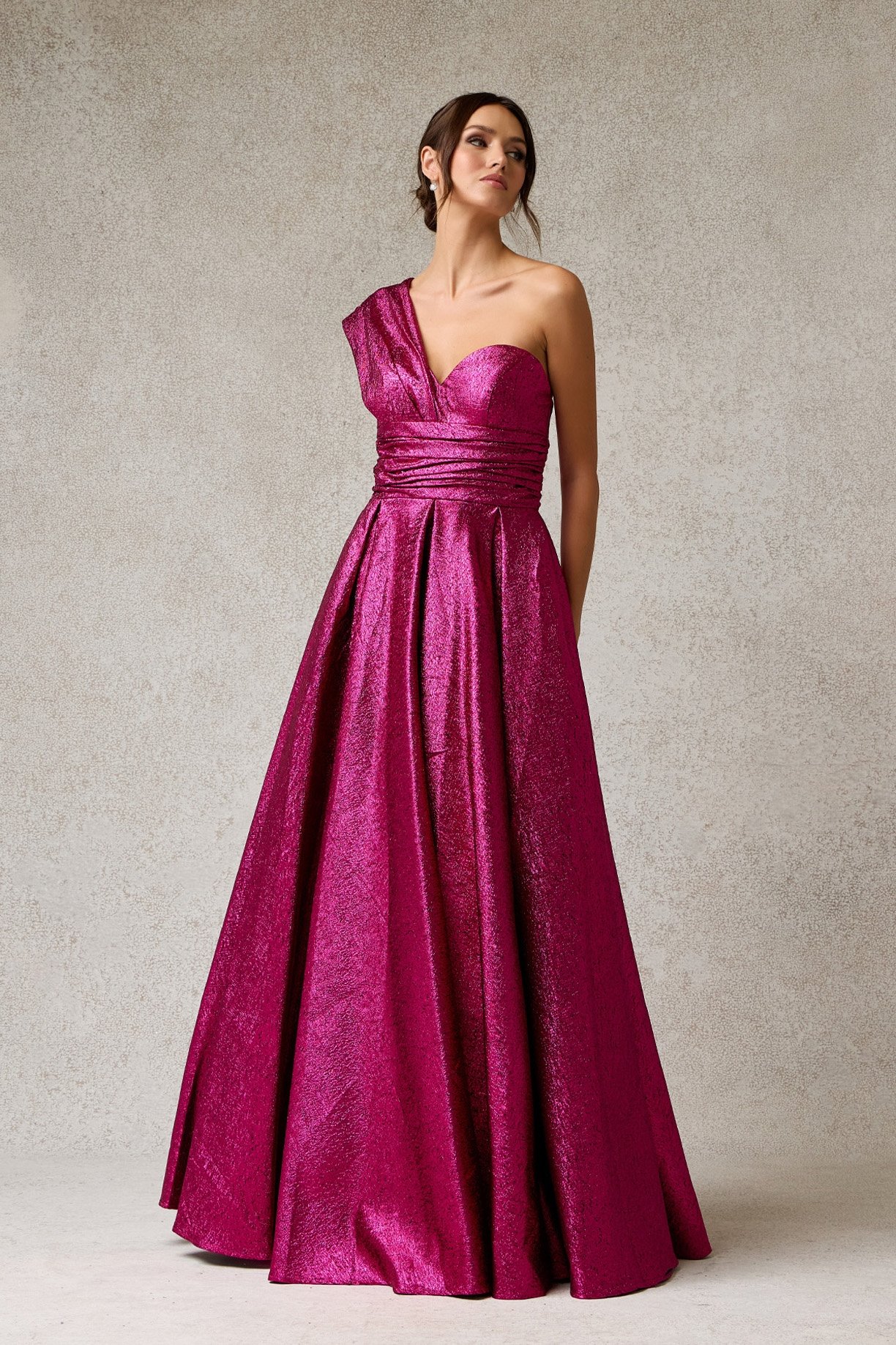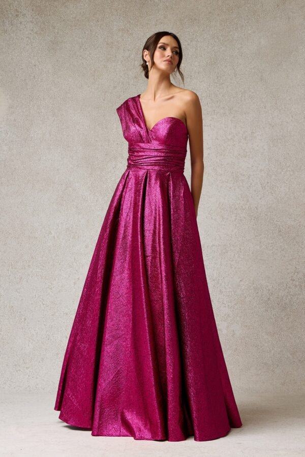 Este audaz vestido destaca por su vibrante color y su acabado en textura lamé metálica. Presenta un moderno diseño asimétrico de un solo hombro con detalles drapeados en la cintura que realzan la silueta, abriéndose en una falda voluminosa con pliegues estructurales de alta costura.