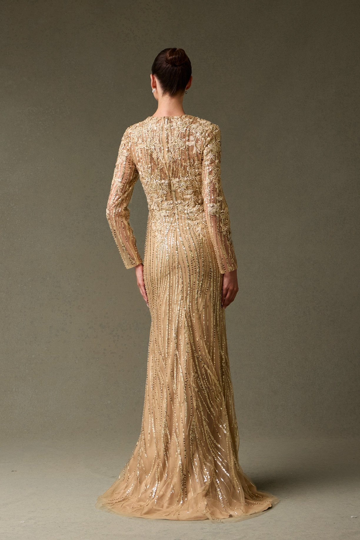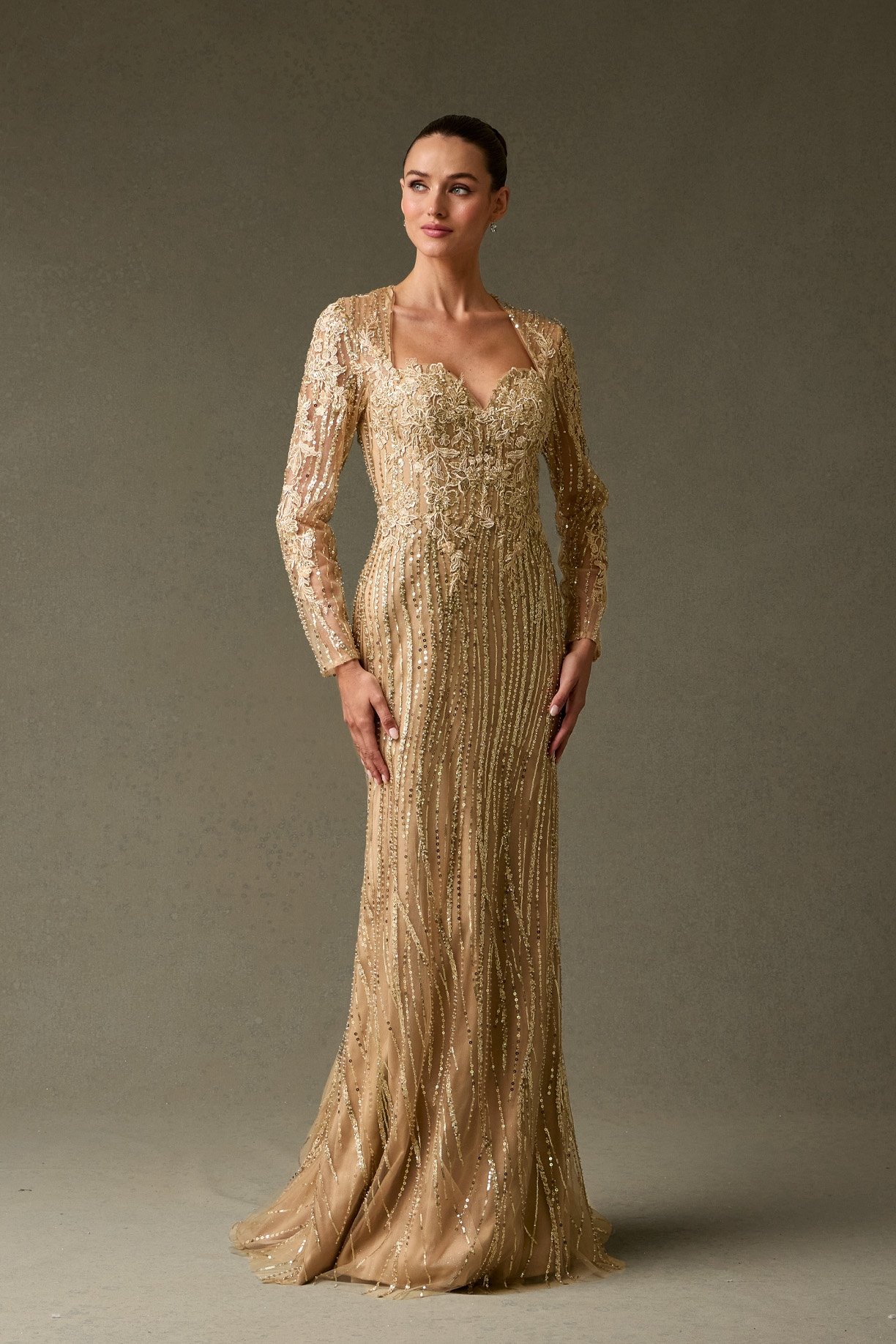 Un vestido de corte sirena que personifica el glamour máximo, confeccionado íntegramente con flecos de lentejuelas doradas dispuestos en líneas verticales para estilizar la figura. Presenta un escote corazón enmarcado por una estructura de hombros y mangas largas bordadas, creando un efecto de brillo constante con cada movimiento. Ideal para mamá de la novia/o y eventos formales.