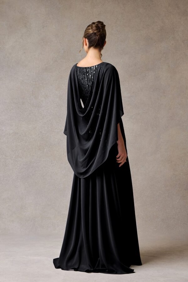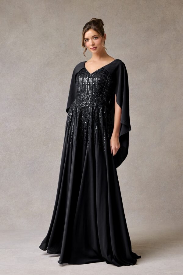 Hermoso vestido línea A, con escote corazón y una capa que le añade un toque de elegancia al look. Perfecto para eventos formales y de gala.