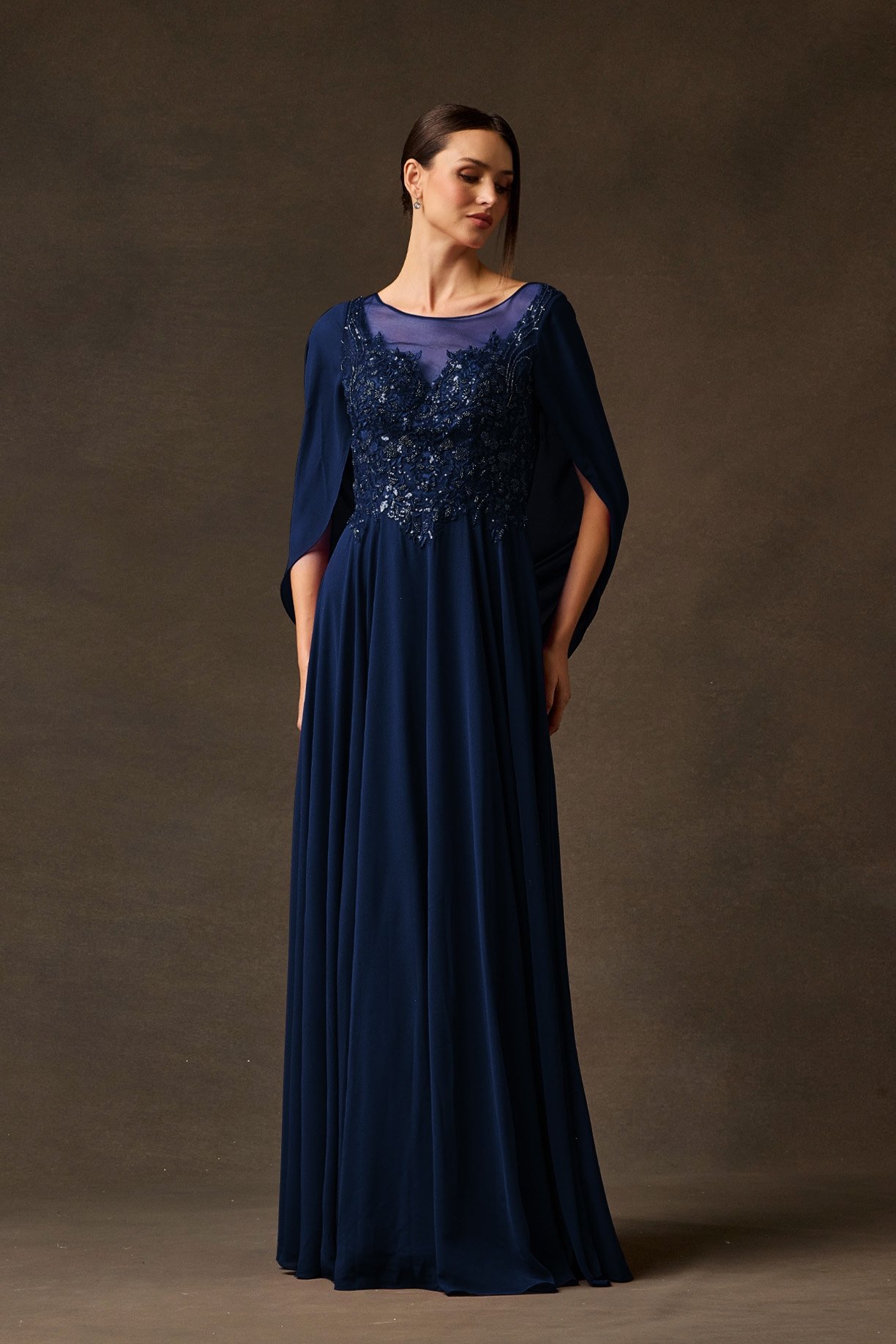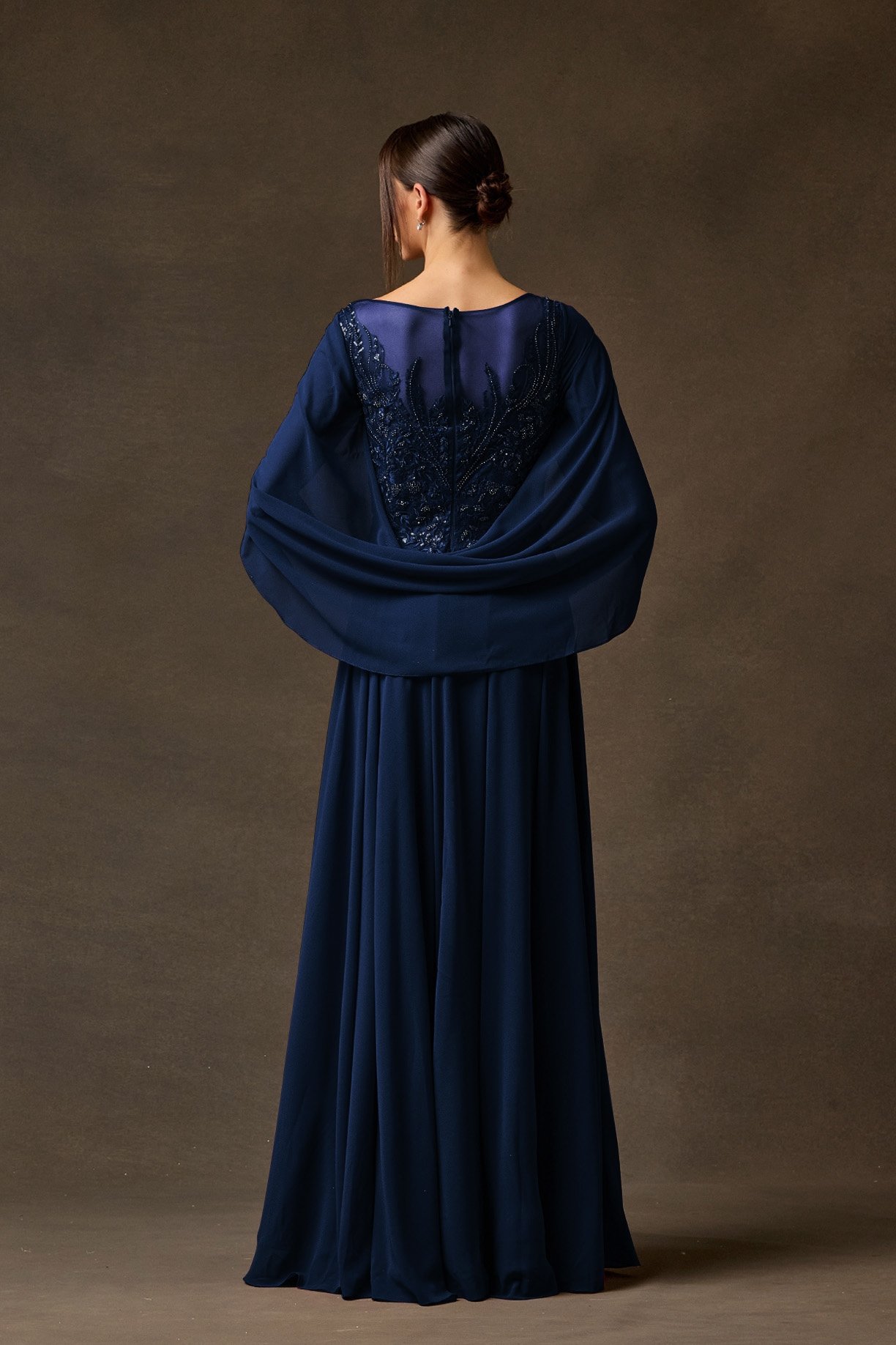 Este diseño destaca por su originalidad al incorporar una capa integrada que nace de los hombros y cae con elegancia hacia la espalda. El frente muestra un corpiño bordado con cristales sobre malla, manteniendo un escote redondo cerrado y una falda fluida que aporta elegancia.