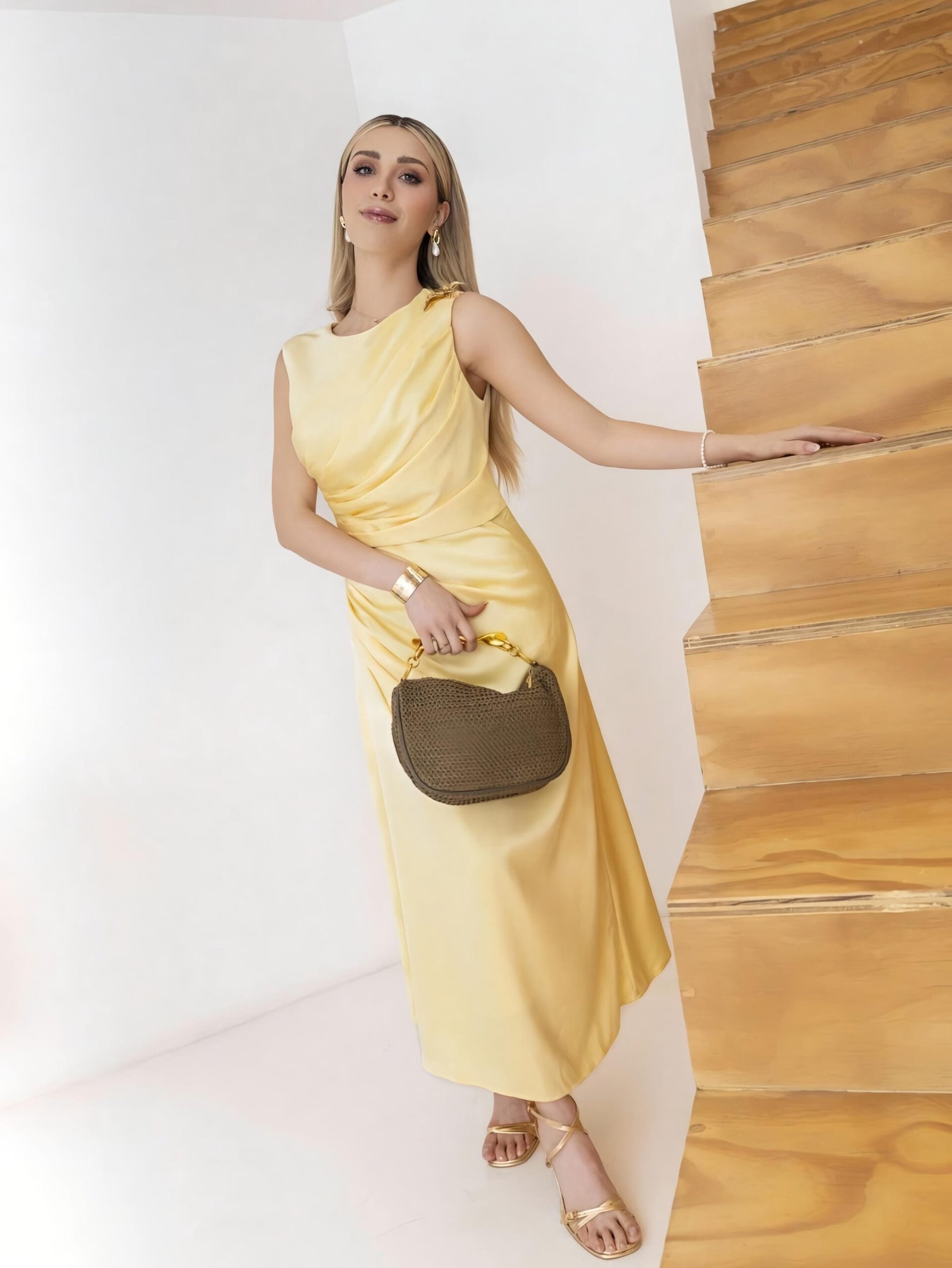 Un diseño luminoso con un elegante escote asimétrico y detalles drapeados en la cintura que crean un efecto envolvente. El tejido satinado aporta un brillo suave y una caída fluida, ideal para celebraciones de día o eventos primaverales.