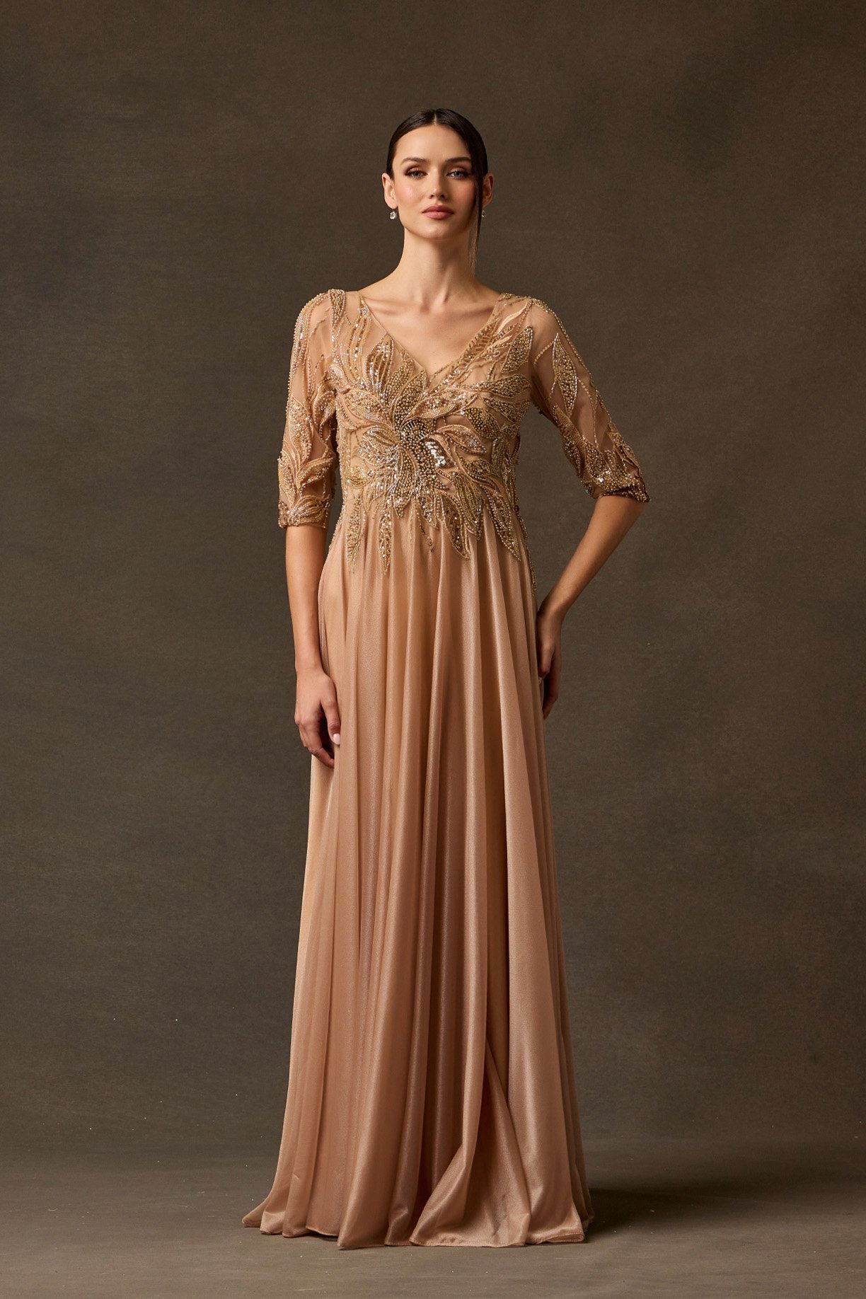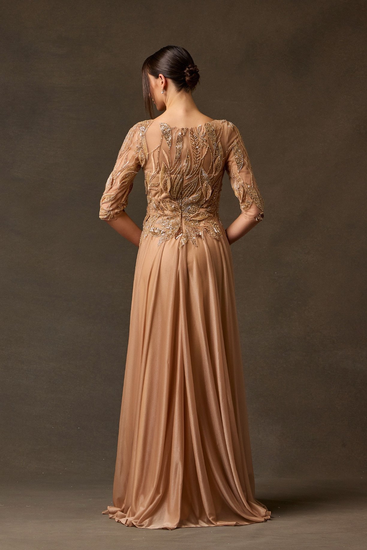 Una pieza que destaca por su intrincado bordado de hojas doradas y lentejuelas que cubren el torso y las mangas translúcidas. El diseño cuenta con un escote en “V” y una falda vaporosa. Perfecto para eventos de etiqueta o cualquier ocasión en la que desee lucir radiante y clásica.