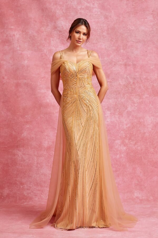 Una pieza elegante de silueta entallada, cubierta por completo con patrones geométricos de lentejuelas doradas que convergen en la cintura para estilizar la imagen. El diseño se completa con tirantes dobles de pedrería y unas mangas caídas de tul que se transforman en una capa posterior.