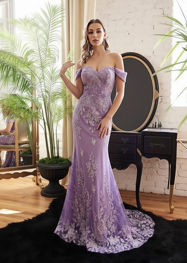 Acapara todas las miradas con este vestido de tipo sirena con hombros descubiertos. Confeccionado con aplicaciones de encaje adornado con flores que aportan un toque de lujo. El escote corazón resalta y se complementa con la espalda tipo corsé con cordones. Con estas características, te sentirás muy hermosa.