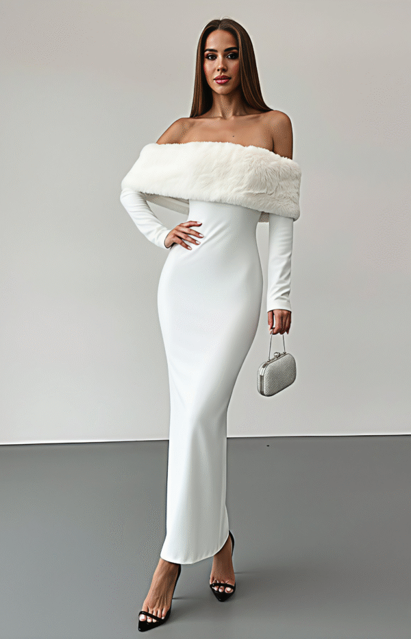 Elegante vestido blanco de corte minimalista y silueta ajustada. Destaca por su sofisticado escote con detalle de pelo sintético y mangas largas.