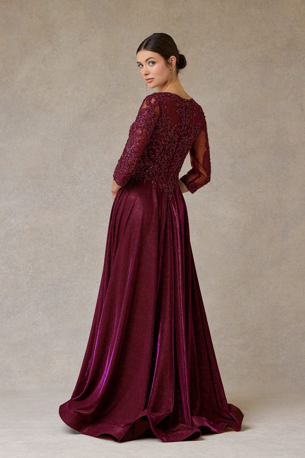 Hermoso vestido de línea “A”. Presenta un corpiño bordado y una falda de brillo intenso que aporta mucho movimiento.