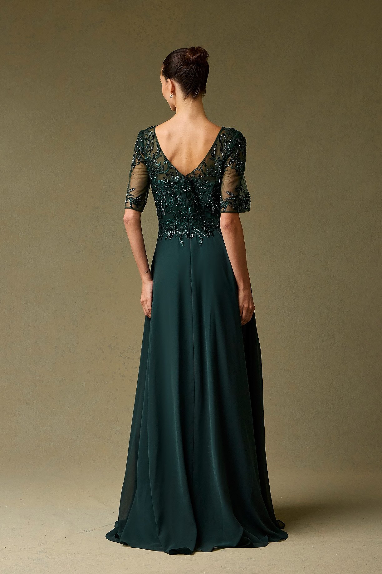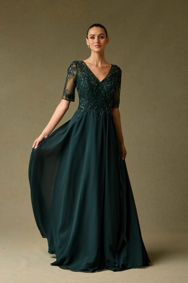 Este elegante vestido presenta un corpiño intrincado de encaje floral con pedrería brillante y mangas cortas de malla. Su diseño combina la estructura artesanal de la parte superior con una falda de línea A en tejido vaporoso, ideal para eventos formales.