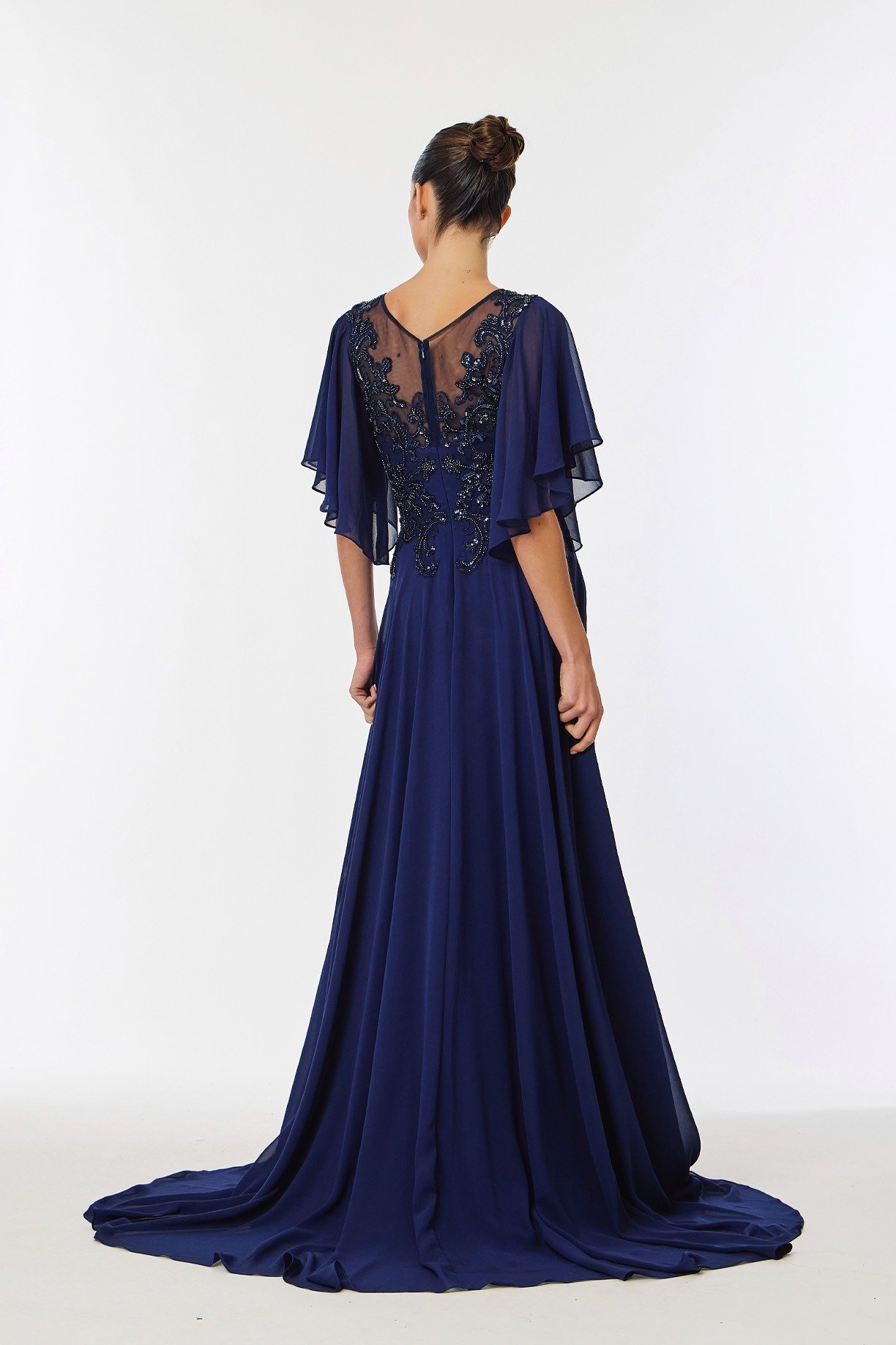 Elegante vestido con un estilo romántico. Lo más llamativo son sus mangas tipo mariposa y el pecho de malla transparente con bordados florales y lentejuelas. Ideal para madre del novio/a.