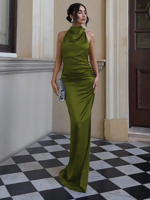 Vestido de satén con cuello alto tipo halter drapeado y silueta columna que se ajusta suavemente al cuerpo.